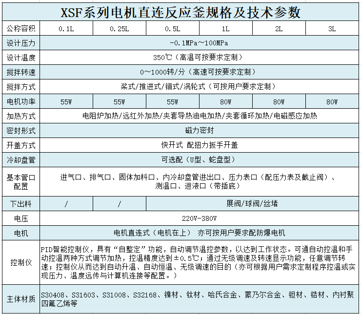 材質一般有碳錳鋼、不銹鋼、鋯、鎳基(哈氏、蒙乃爾、因康鎳)合金等有色金屬及其它復合材料,加熱/降溫方式,可分為電加熱、熱水加熱、導熱油循環(huán)加熱、蒸汽加熱、遠紅外加熱、外(內)盤管加熱、電磁感應加熱等,夾套降溫和釜內盤管降溫等。加熱方式的選擇主要跟化學反應所需的加熱/降溫溫度,以及所需熱量大小有關。攪拌器有錨式、框式、槳式、渦輪式,刮板式,組合式等多層復合槳。根據(jù)不同工作環(huán)境的工藝需要進行設計、制造。